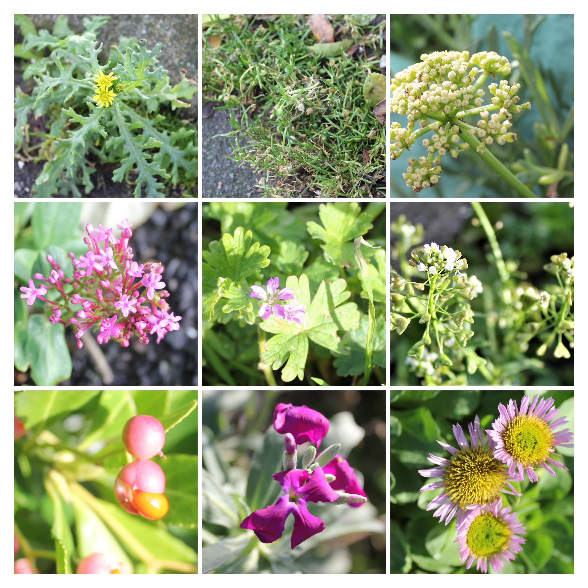 From top left to right: Oxford Ragwort, Sea Pearlwort, Rock Samphire, Red Valerian, Dovesfoot Geranium, Shepherds Purse, Japanese Spindly, Hoary Stock, Seaside Fleabane