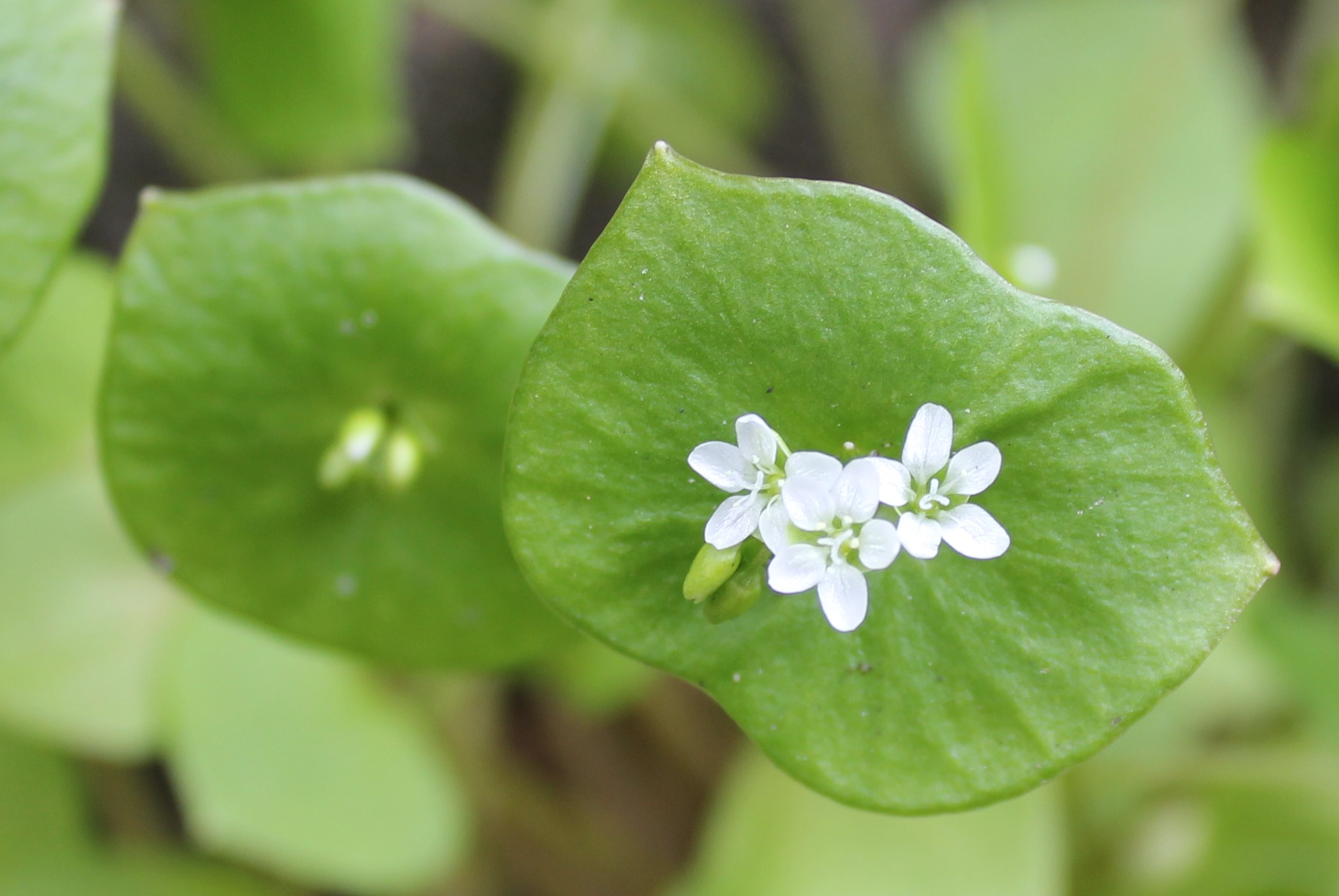 Edging the pavement in front of the care home, I find eye-catching green sprigs of Springbeauty (Claytonia perfoliata). The fused and slightly fleshy leaves beneath clusters of delicate five-petalled flowers are unmistakable. This plant, native to western North America, is edible and has a mild fresh taste. Also known as Miner’s Lettuce, research suggests that it was eaten by Gold Rush miners to prevent scurvy. A US botanist kindly confirmed that this is generally accepted in California as being the origin of the name.
