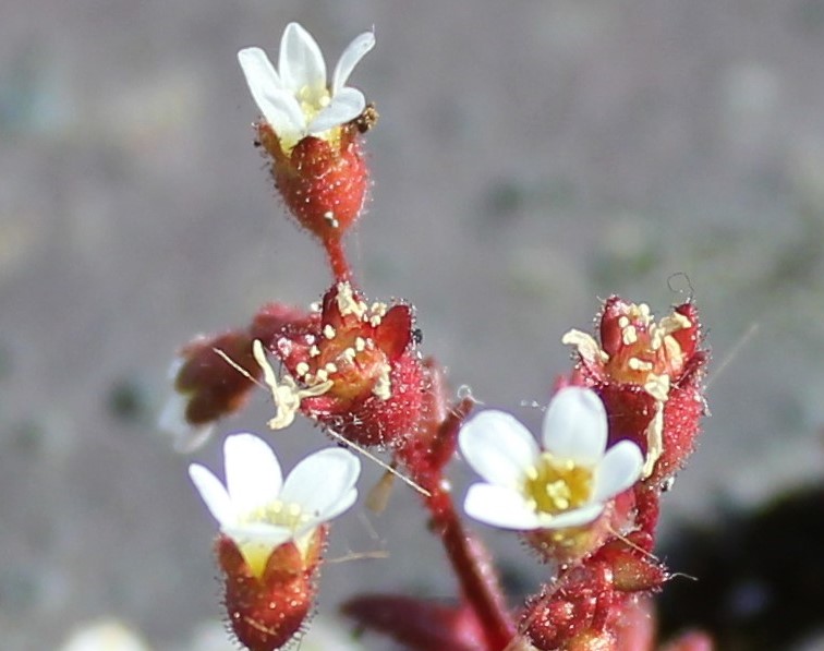 Further along the Thames Path I notice a haze of red on the sloping bricks of the river wall and lean over for a closer look. I’ve never seen this plant before but I know instantly it’s Rue-leaved Saxifrage and it’s in flower too. Over the last few months, some of botany acquaintances have been posting pictures of the leaves of this plant from sites around Lambeth. I managed to resist the urge to rush out and plant-twitch as I was rather hoping to find some for myself in Southwark. It ticks all the boxes being tiny, a gorgeous colour and with achingly beautiful flowers.