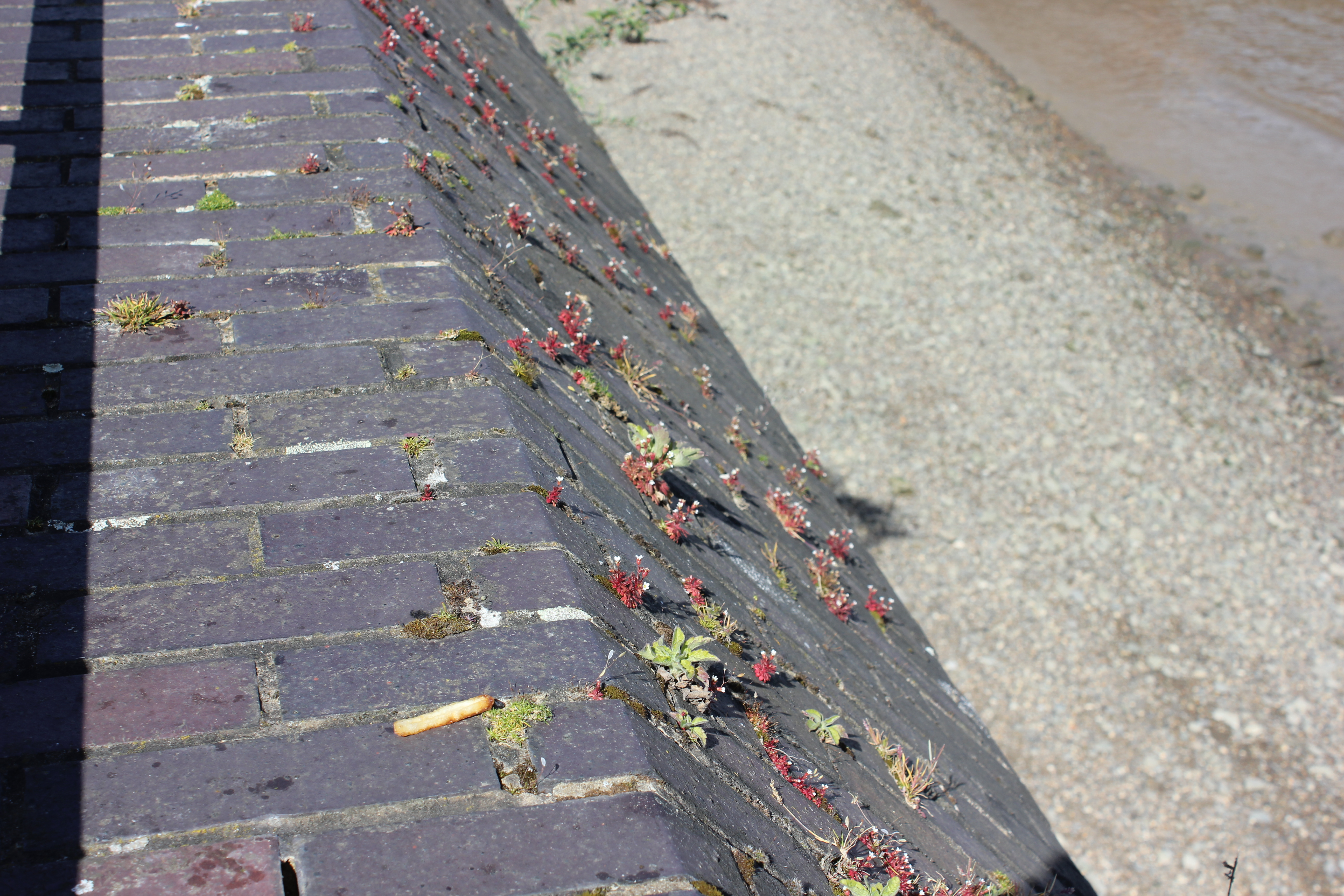 Southwark Park is a relief after the grime and increasing traffic and after a quick coffee stop, I leave the park to meet the Thames Path at Bermondsey Wall. Here the remaining stonework of Edward the Third’s house has been colonised by Buck’s-horn Plantain, Common Mouse-ear and what I think is English Stonecrop – after sticking a leaf in my mouth to check that it’s not acidy-tasting Biting Stonecrop which is not at all advisable.