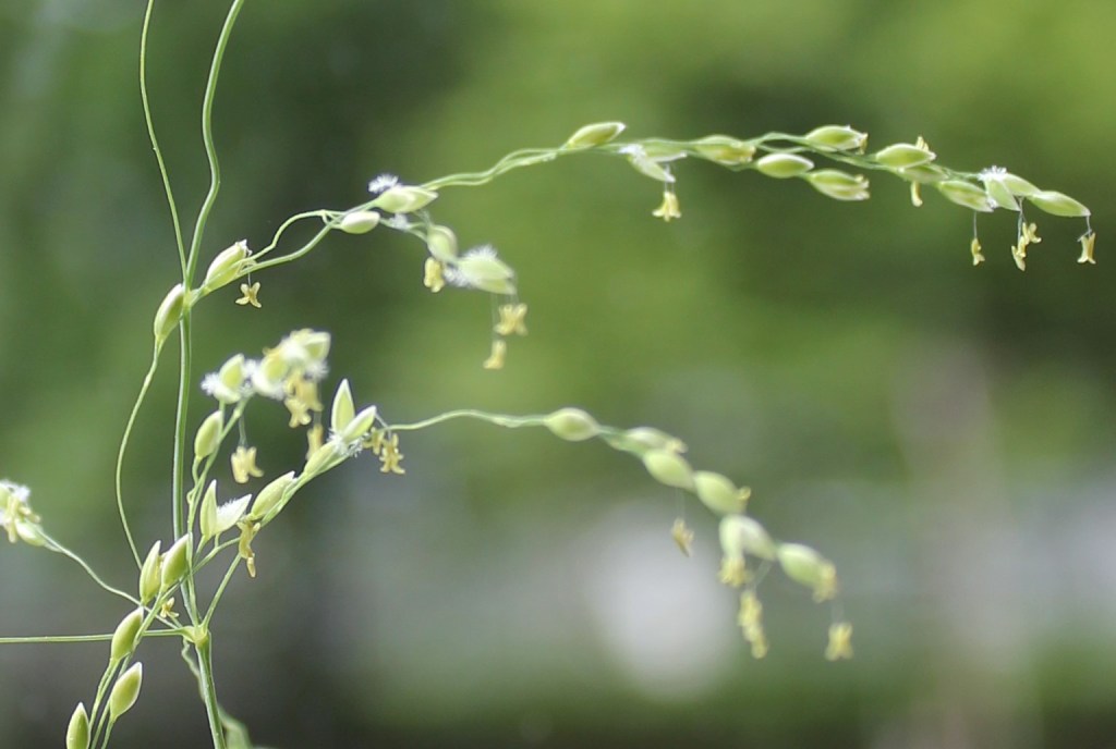 Close up the Wood Millet flowers are achingly beautiful, with each of the anthers loaded with pollen suspended on a tiny filament. Feathery stigmas peak out of some of the flowers too.