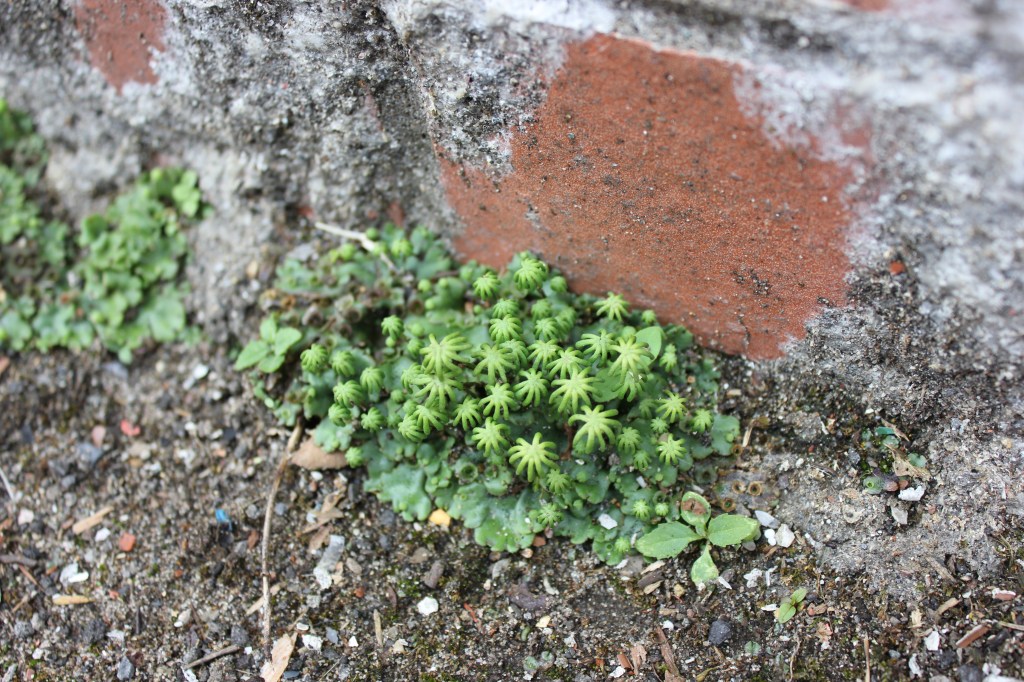 Taking a circuitous route round Cardiff Central station, I find a lovely patch of Umbrella Liverwort – female, Lesser Swine Cress, some attractive Maidenhair Spleenwort, Scarlet Pimpernel, Ivy-leaved Toadflax, Soft Brome and Barren Brome. There’s a grass I’m not entirely sure of but I think it’s Water Bent. I’m sure someone will be able to tell me.