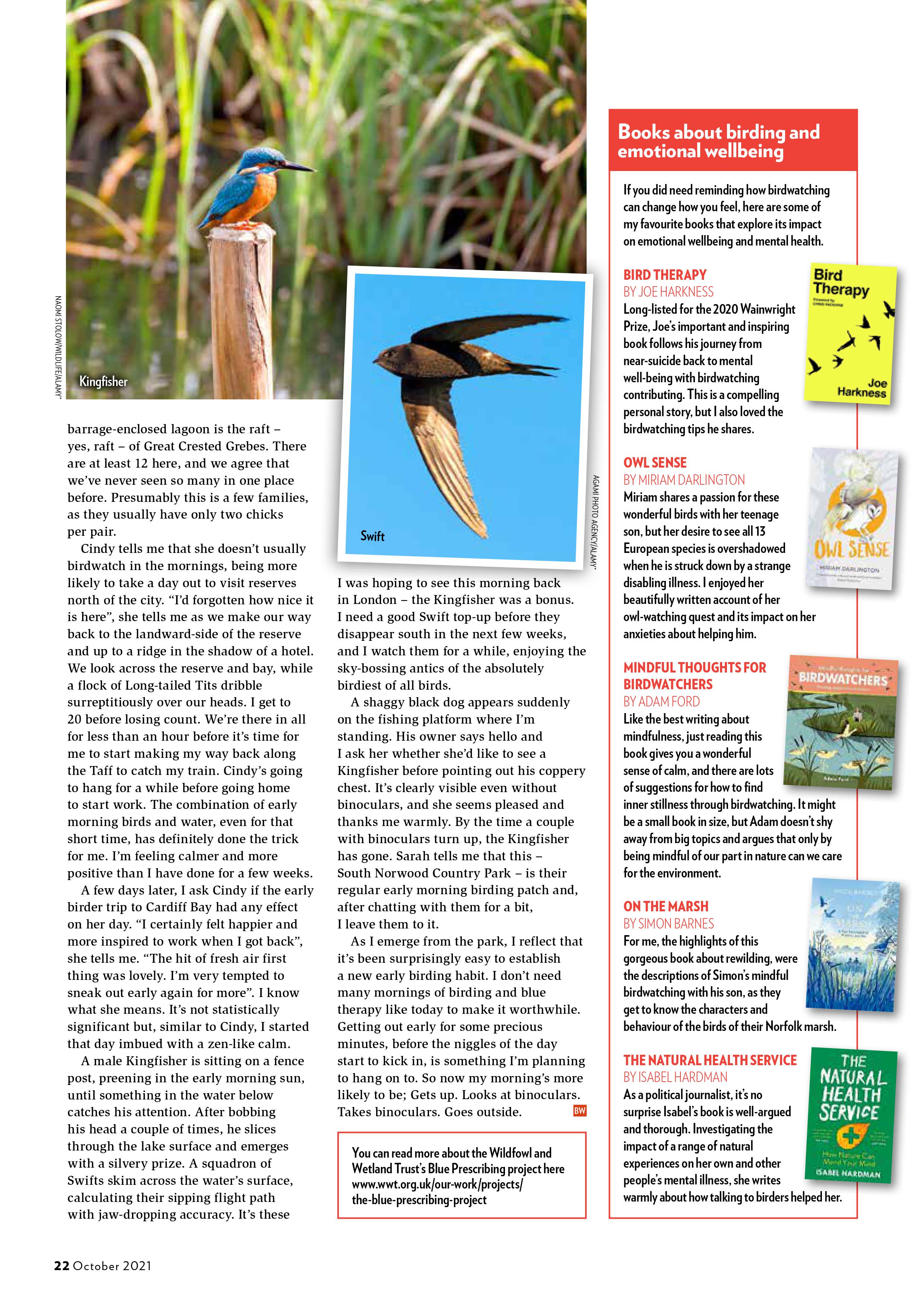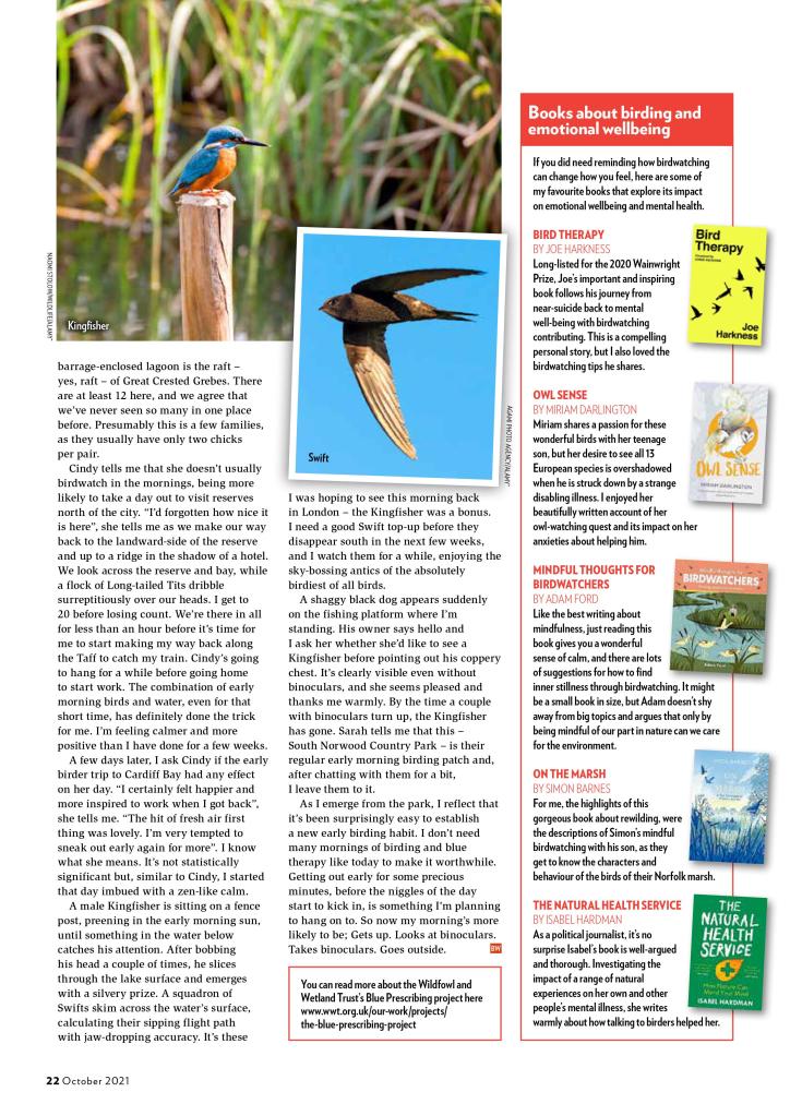 I’m having such a lovely time writing these articles for the wonderful Bird Watching Magazine. And it’s a great excuse to chat to some really interesting people. This one features Dr Jonathan Reeves (Wildfowl and Wetland Trust, Chantelle Lindsay (London Wildlife Trust) and Cindy Howells, a birder and geologist I met up with in Cardiff. Also an opportunity to share some of my favourite nature and emotional wellbeing books from Joe Harkness, Miriam Darlington, Adam Ford, Simon Barnes and Isabel Hardman.