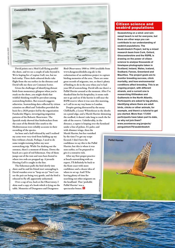 What an extraordinary place Dungeness is… and a great place to have a first proper go at seawatching in the expert company of David Walker, warden at Dungeness Bird Observatory. Oh, and have a mentioned I saw a pallid harrier that day too??