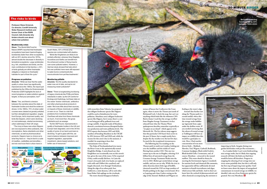There’s no doubt in my mind that sorting water pollution should be a national priority – and it’s one which does seem to bridge the political spectrum. In my May column I investigate the impact which river pollution is having on birds and have a fascinating chat with Professor Steve Ormerod about his research on water pollution and Dippers.